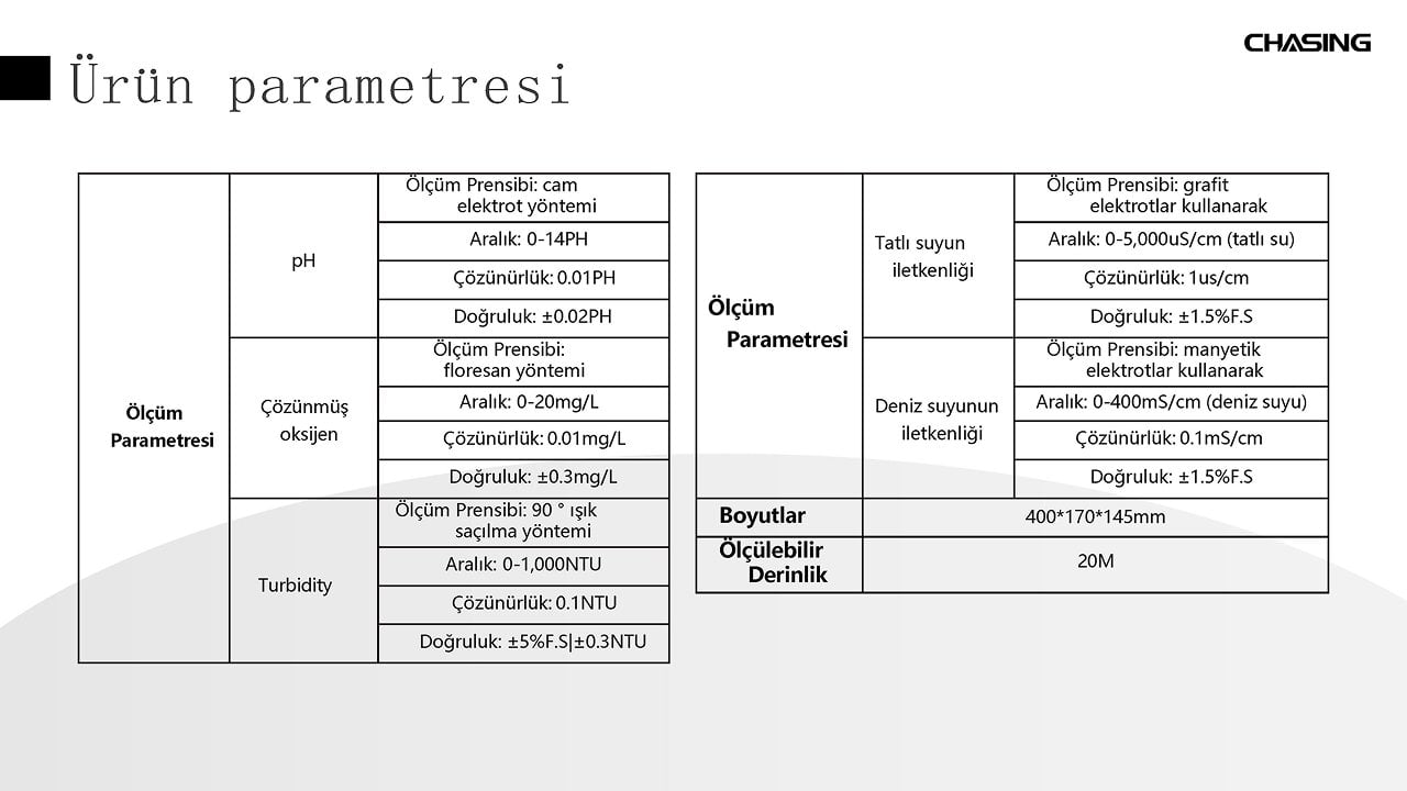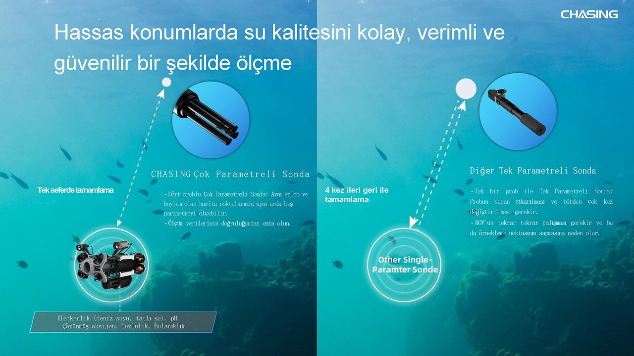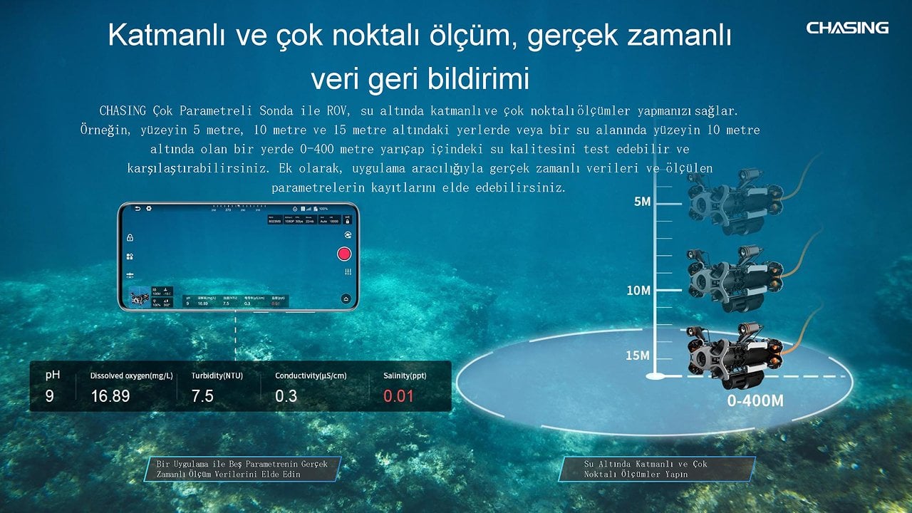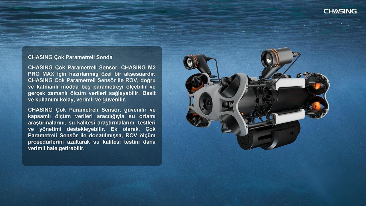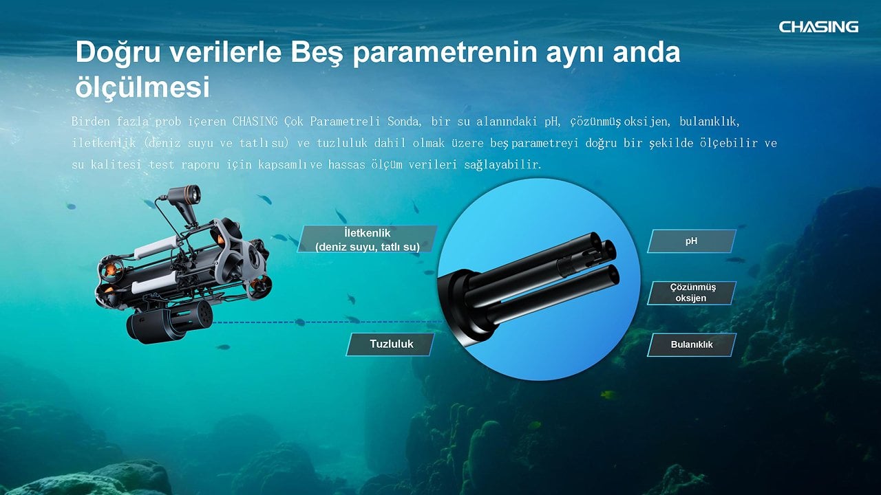 CHASING M2 Pro Max için geliştirilmiş çoklu su kalitesi ölçüm modülüdür. Tek dalışta birden fazla parametreyi eş zamanlı ölçerek su ortamı analizlerini hızlı, doğru ve verimli hale getirir. Gerçek zamanlı veri sağlayarak saha çalışmalarında örnekleme ihtiyacını azaltır.