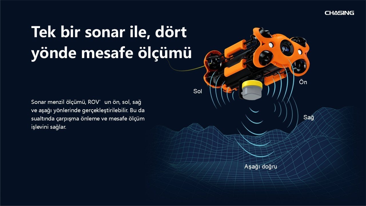 Dört Yönlü Ölçüm: ROV'un ön, sol, sağ ve alt yönlerinde mesafe ölçümü ve engel tespiti.