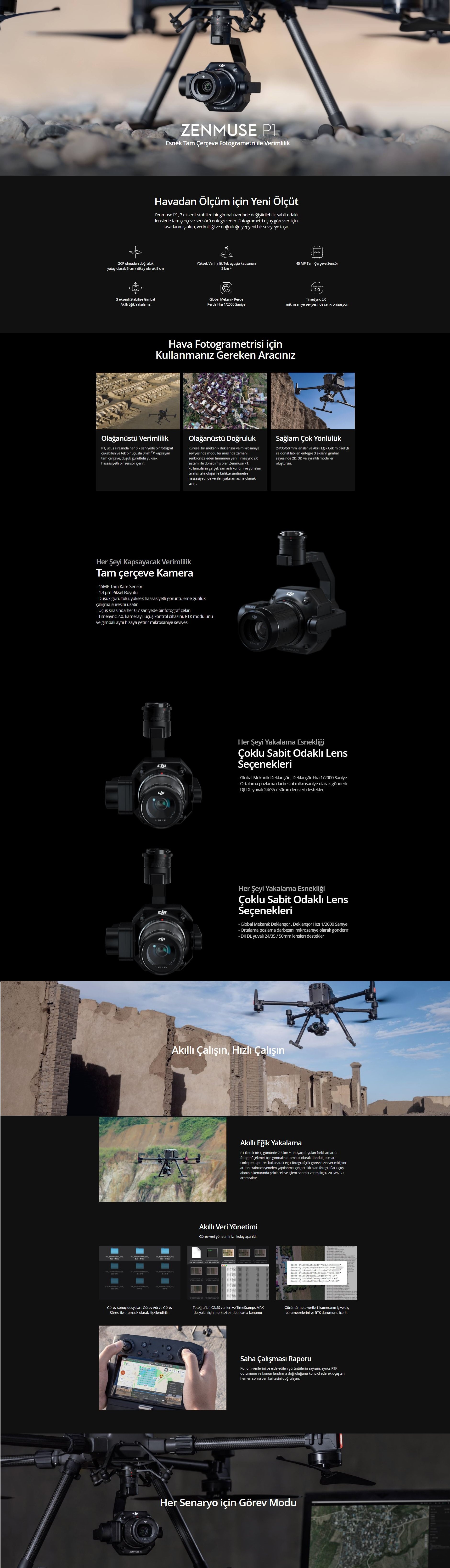 Zenmuse p1 drone, 3 eksenli stabilize bir gimbal üzerinde değiştirilebilir sabit odaklı lensler ile tam çerçeve sensörü entegre eden bir cihazdır. Aynı zamanda fotogrametri uçuş görevleri adına tasarlanmış olup, performansı ve doğruluğu çok yeni bir düzeye taşımaktadır. P1, uçuş esnasında her 0.7 saniyede bir fotoğraf çekebilen ve tek bir uçuşta 3 kilometrekareyi kapsayan tam çerçeve, az gürültülü yüksek hassasiyetli bir sensör içermektedir.