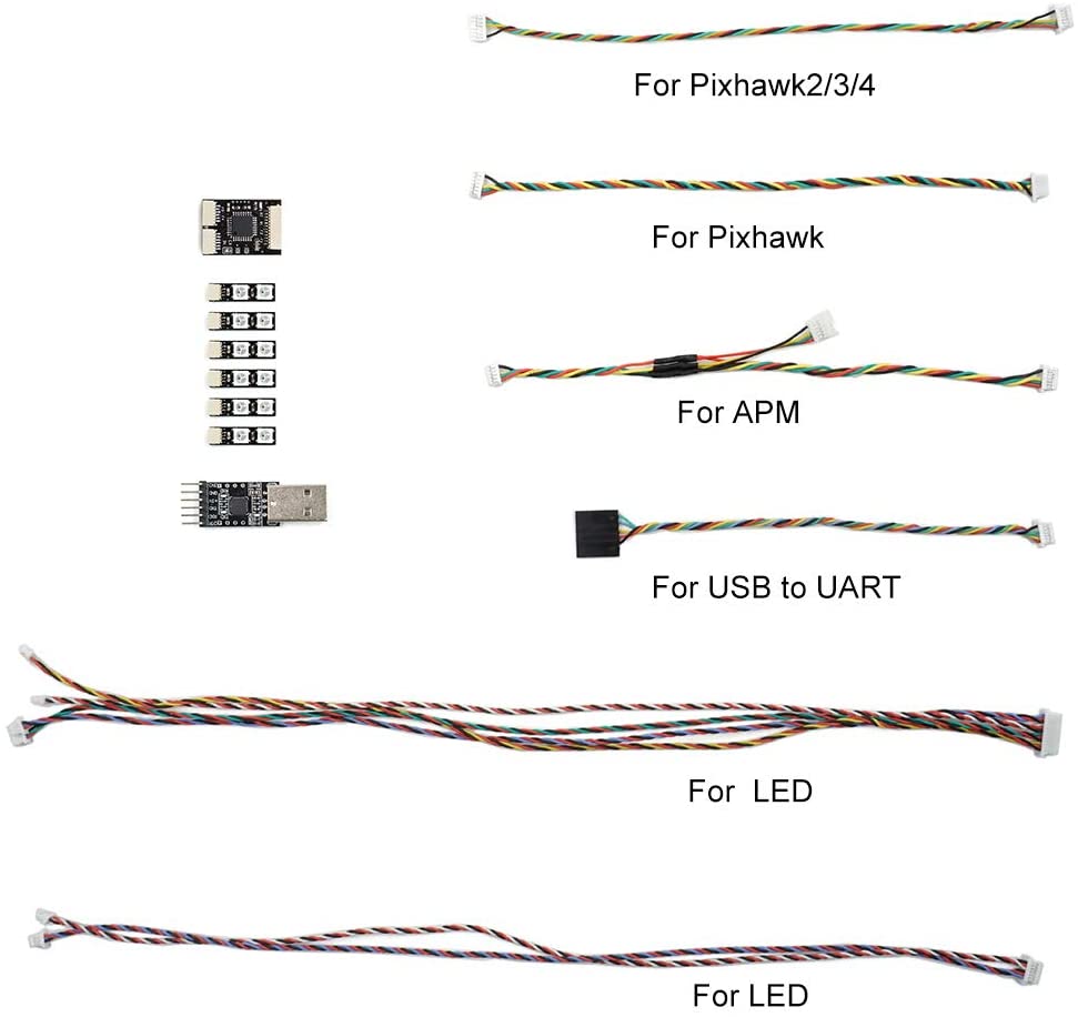 Mavlink LED kontrol cihazı bir denetleyici kartı, 6 set vurgulama LED şeritler ve bir USB UART modülü içerir. Pixhawk seri, APM seri, Pixracer, NAVIO2, PXFmini vb. Gibi ardupilot veya PX4 firmware ile herhangi bir uçuş kontrolörü ile uyumludur. Mavlink 1 ve Mavlink 2 ile uyumludur
